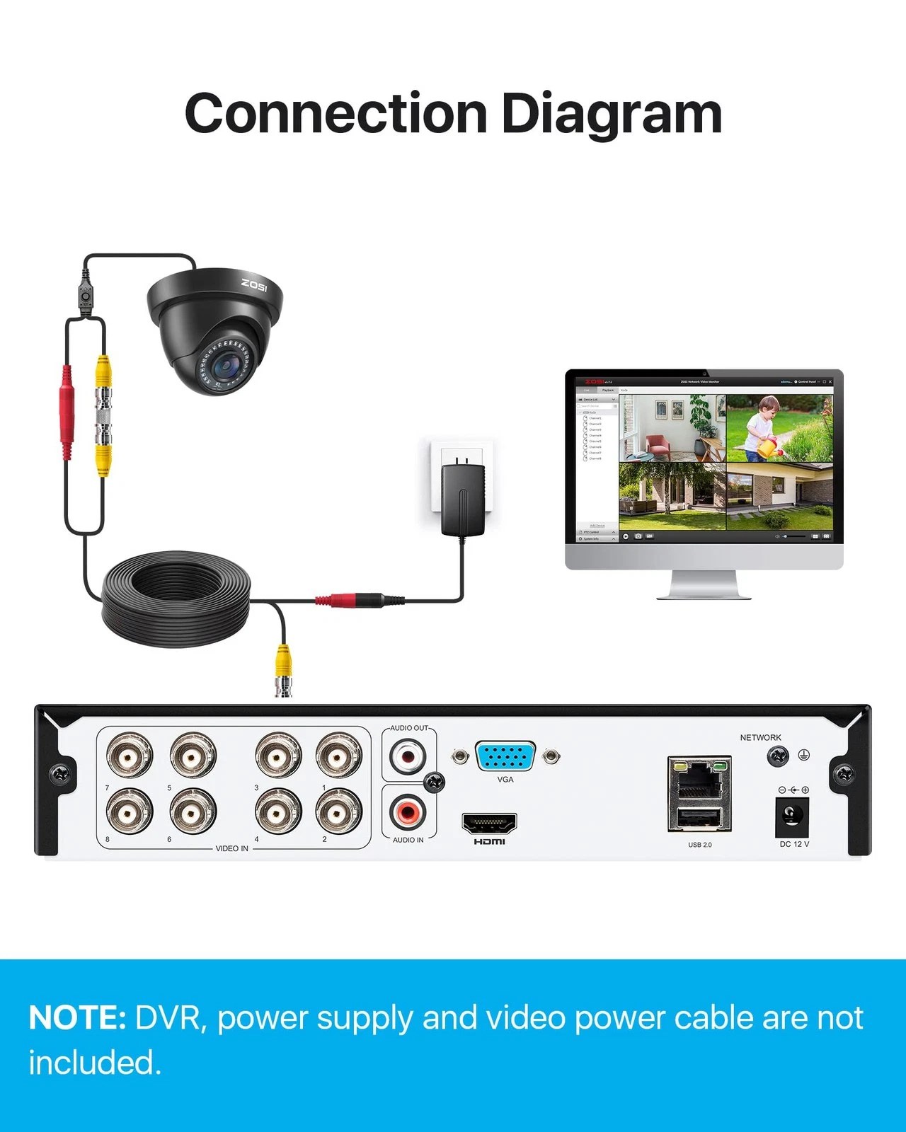 - ملاحظة: يأتي نظام الأمان هذا مع مصدر طاقة وكابل طاقة الفيديو، ولكن لا يحتوي على DVR. لا يمكن تشغيله بشكل مستقل ويجب توصيله بـ DVR للعمل.